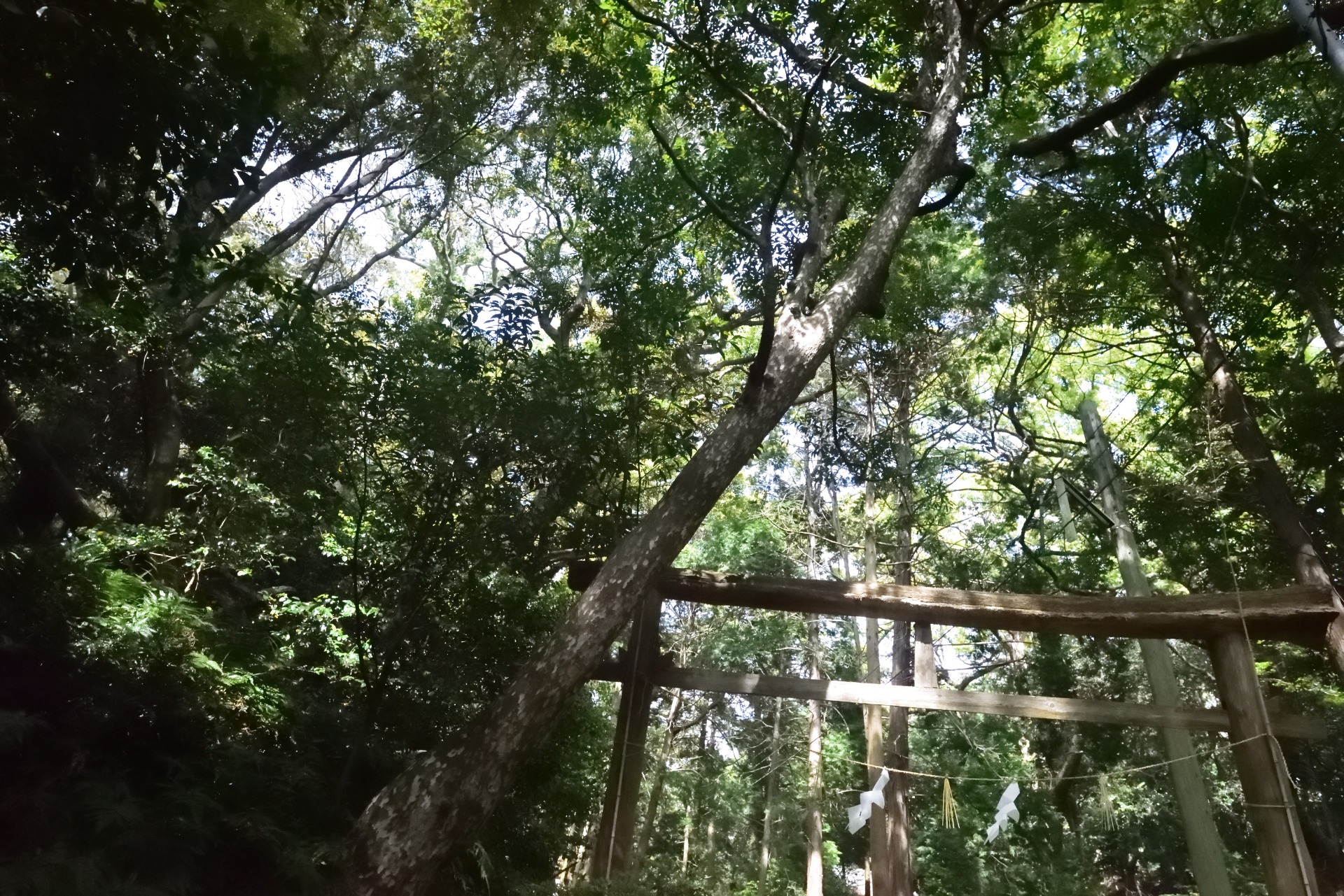 原生林の中に立つ鳥居。山頂の方向を遥拝。
