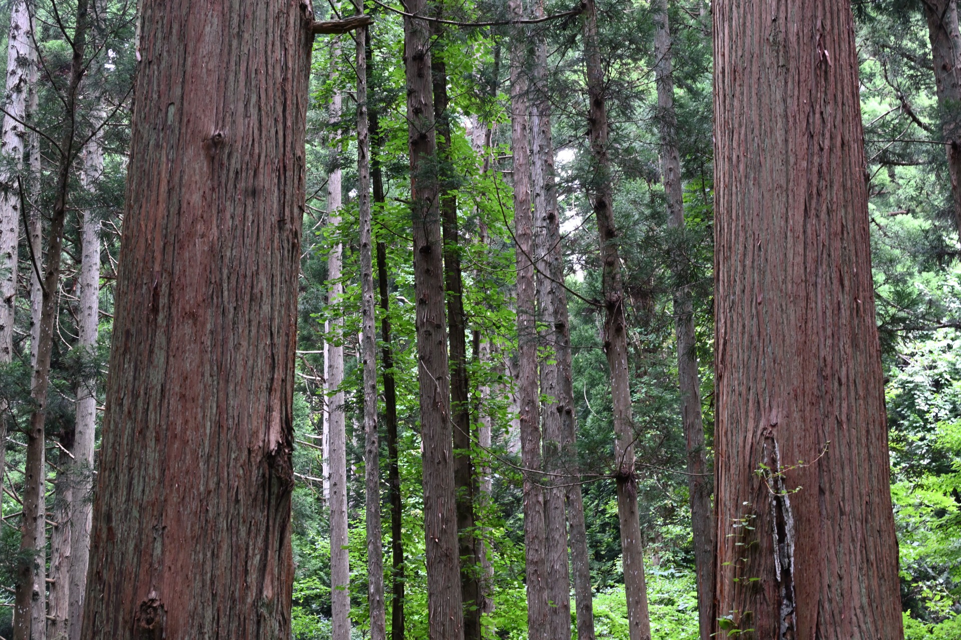 起点に戻るためにはもう一度峠越えをしなければならず、ここからまた登りです。最初、踏み跡程度でわかりにくく、慎重に進みます。こちらの道は傾斜がやや緩く人工林が見られましたが、時折、広葉樹の大径木も。 直径1m超えのブナ。ご神木として残されたもの、との説明。